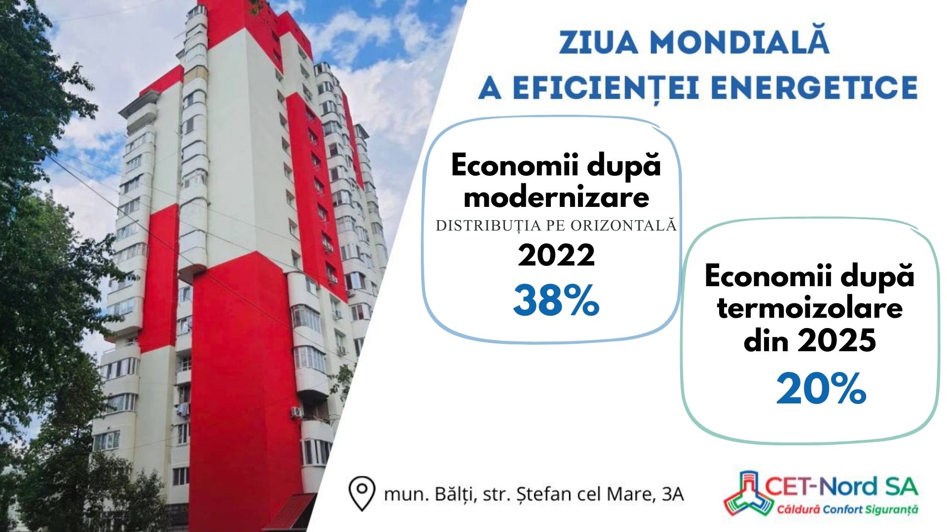 S.A. „CET-Nord” susține activ proiectele de eficiență energetică, care contribuie la modernizarea fondului locativ, reducerea consumului de resurse și la construirea unui sistem energetic mai durabil pentru comunitatea noastră.